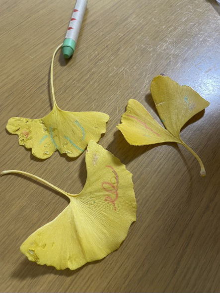 銀杏の葉っぱにはクレヨンで絵が描けるということも、以前サポートさせて頂いたママさんからお聞きしていましたので、合わせてお伝えしました。