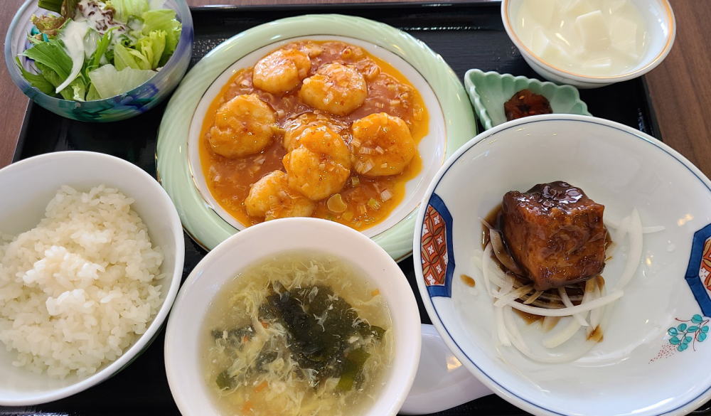 エビチリ定食なのに豚の黒酢角煮も食べられるというお得ランチ。
