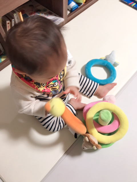 ママさんとMくんがお風呂に入っている間に輪投げで遊びましたので、写真をパチリ。それにしても…飾っておくだけでも十分なくらい輪投げがかわいいです♡