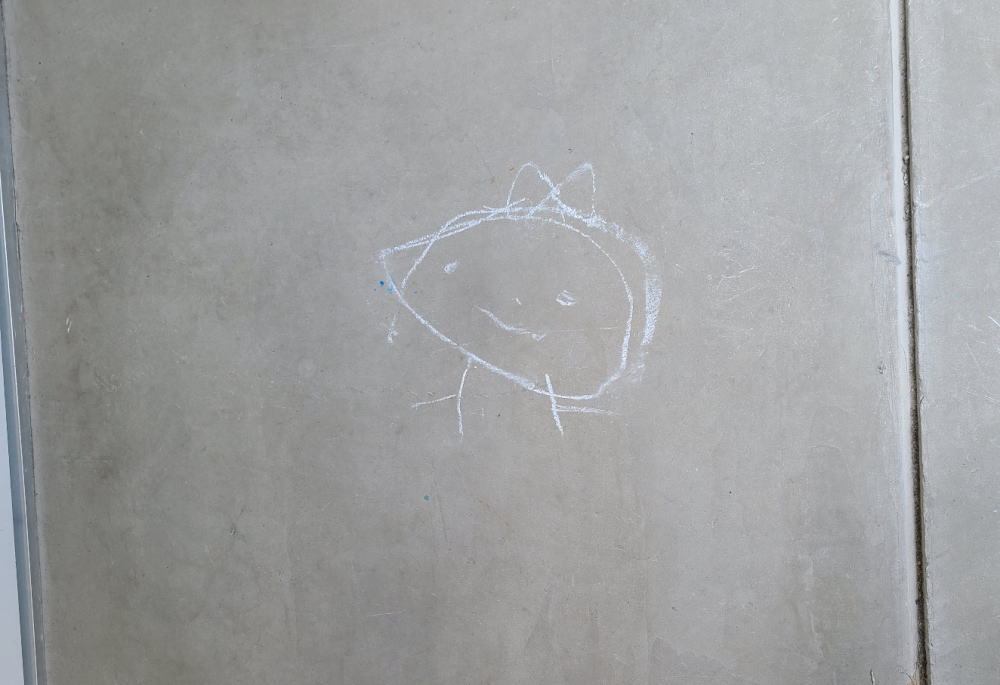 写真は玄関ドアの前に書いてあったKちゃんのお絵描き。
