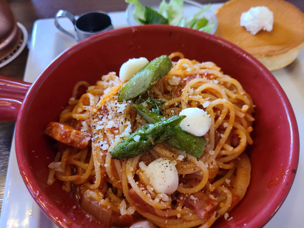 パスタの量が絶妙です。もう少し食べたいなぁと思ったところでそのお腹の隙間にデザートのパンケーキが入るという(笑)