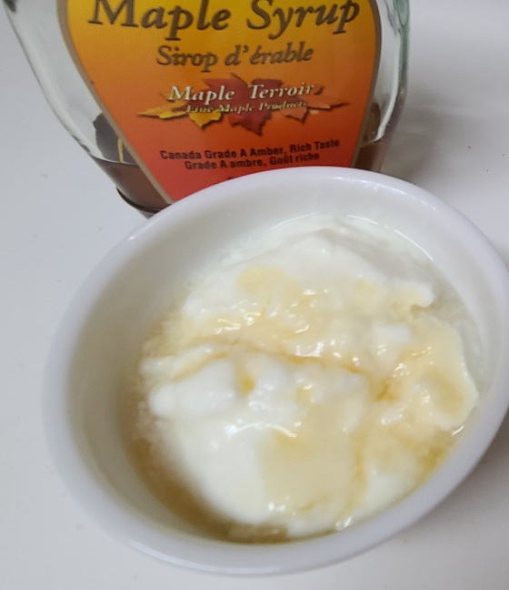 さて、写真は今日のおやつのヨーグルトのメープルシロップ掛け。
