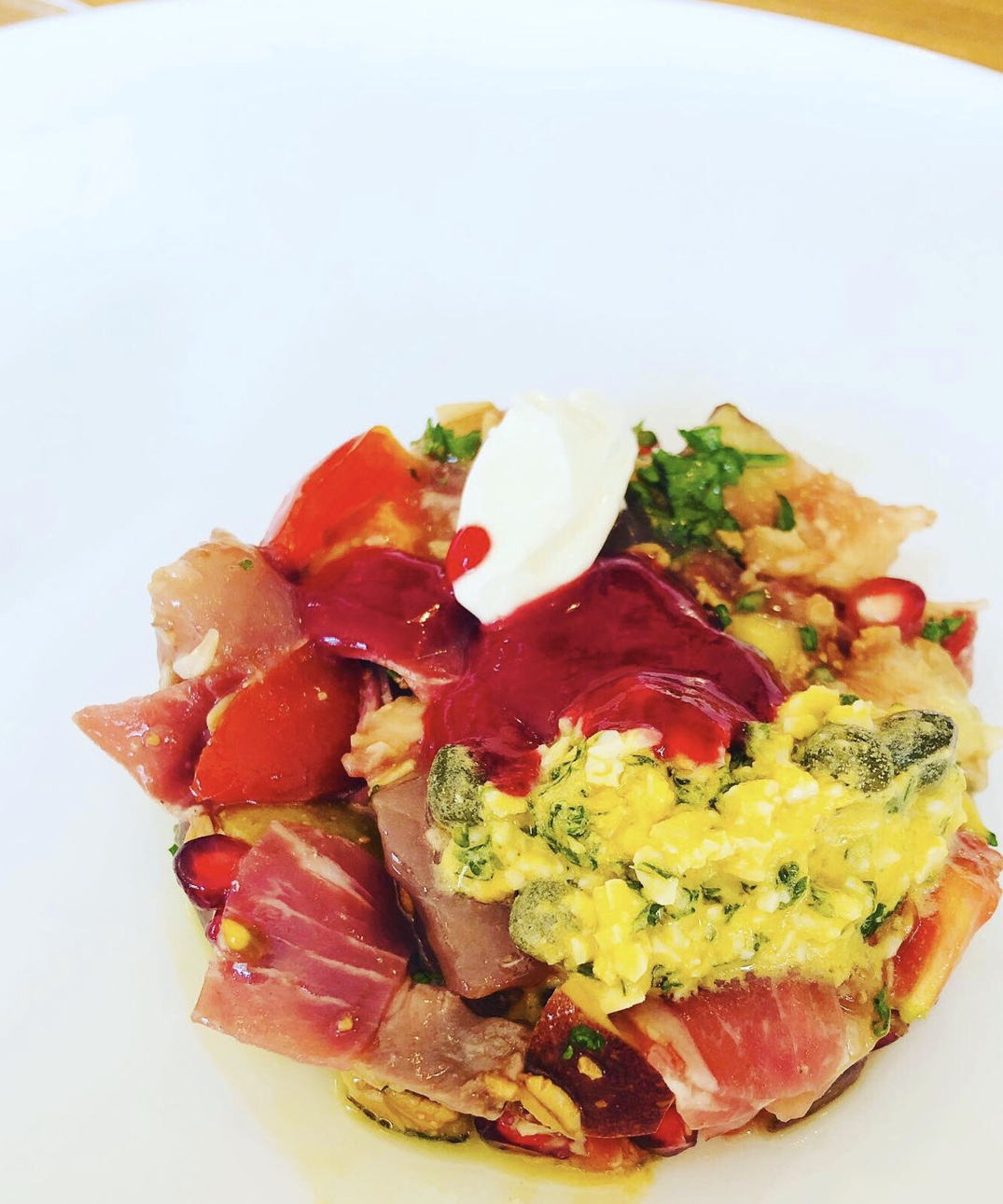 そして…写真は先日友達と出かけた創作フレンチのお店での前菜です。この中に「キハダマグロ、エゾ鹿、生ハム、無花果、ザクロ、トマト、オリーブ、グラノーラ、タルタルソース」などなど…想像を絶する組み合わせの食材が入っています。口に入れると素材の味が色々合わさって、何とも言えない美味しさに♡