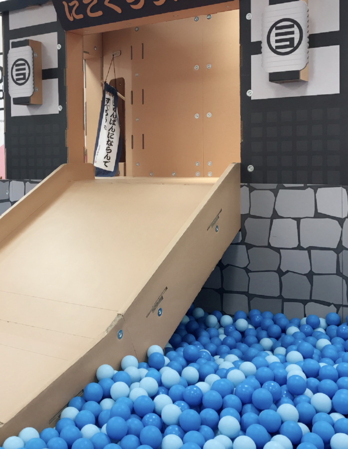 穴にボールを入れると違うところから出てくる簡単なダンボールの仕掛け⁇に永遠とボールを入れ続けます。